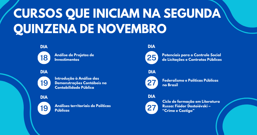 A grade curricular de atividades educacionais da Escola Superior de Gestão e Contas Públicas (EGC) do Tribunal de Contas do Município de São Paulo para esta segunda quinzena de novembro de 2024 destaca a realização de seis cursos de extensão, todos gratuitos e na modalidade online.